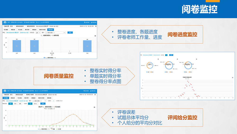 1. 閱卷進(jìn)度監(jiān)控: 顯示試題數(shù)、閱卷教師信息、全部和個(gè)人閱卷任務(wù)數(shù)、已閱份數(shù)、未閱份數(shù)、仲裁份數(shù);顯示整卷進(jìn)度、各題進(jìn)度、評(píng)卷教師工作量及進(jìn)度;